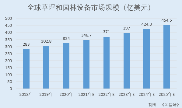 根据全球市场研究公司(Global Market Insights, Inc.)统计数据,2018-2020年,全球草坪和园林设备市场规模分别为283亿美元、302.8亿美元、324亿美元,预计至2025年将超过450亿美元。