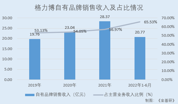 2019-2021年及2022年1-6月,格力博自有品牌销售收入分别为19.76亿元、23.04亿元、28.37亿元、20.77亿元,占主营业务收入比例分别为53.13%、54.05%、56.97%、65.53%。