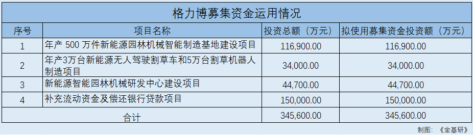 此番上市,格力博拟募集资金34.56亿元投入四个募投项目,分别为“年产500万件新能源园林机械智能制造基地建设项目”、“年产3万台新能源无人驾驶割草车和5万台割草机器人制造项目”、“新能源智能园林机械研发中心建设项目”、“补充流动资金及偿还银行贷款项目”。