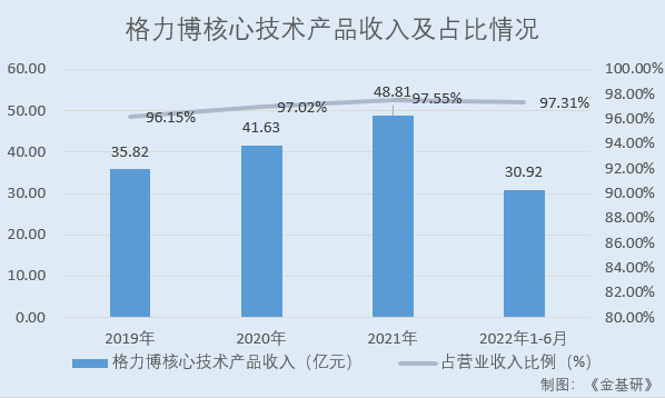 2019-2021年及2022年1-6月,格力博核心技术产品收入分别为35.82亿元、41.63亿元、48.81亿元、30.92亿元,占营业收入的比例分别为96.15%、97.02%、97.55%、97.31%。