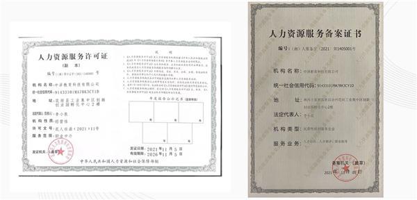 中泽教育在政 府相关部门的长期严格考察后,于 2021 年 11 月正式依法获得职业教育行业准入资质——人社部《人力资源服务许可》,服务业务涵盖职业教育行业人才培训、人才测评、职业指导等,是目前国内职业教育领域为数不多的获得国家认可、并经人社部授权的、具备 " 职业培训 " 合法资格的企业之一。