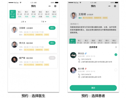以眼科诊所为例,进入到预约页面,患者可根据医生的简介、排班时间预约医生。同样的,作为医生,使用系统时,也可根据的时间选择当天接诊的病患人数。