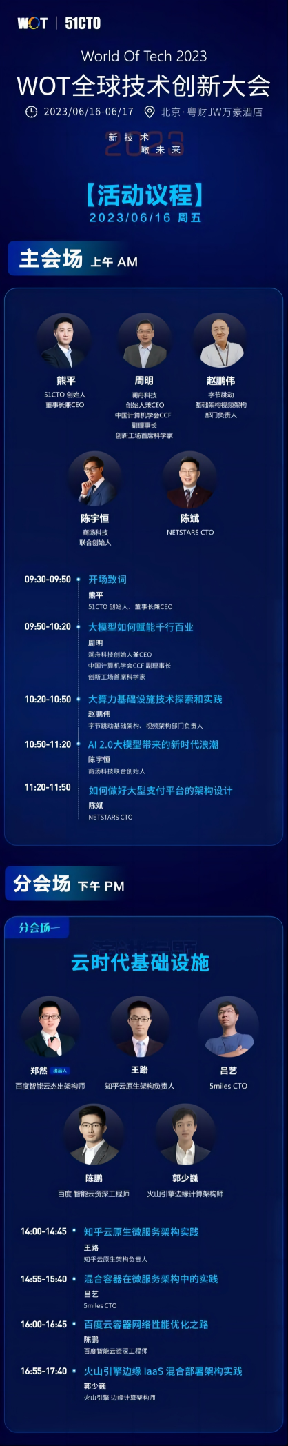 距离6月16日-17日召开的WOT全球技术创新大会还有半个月时间,所有讲师、议题均已就位。本届WOT不仅囊括2023年最 火的技术——AIGC、大模型、大算力,也有被技术人永恒关注的热点话题——多云实践、业务架构演进、效能提升。