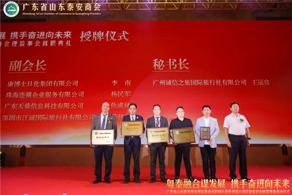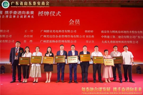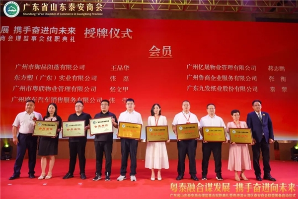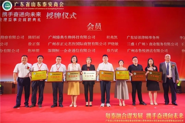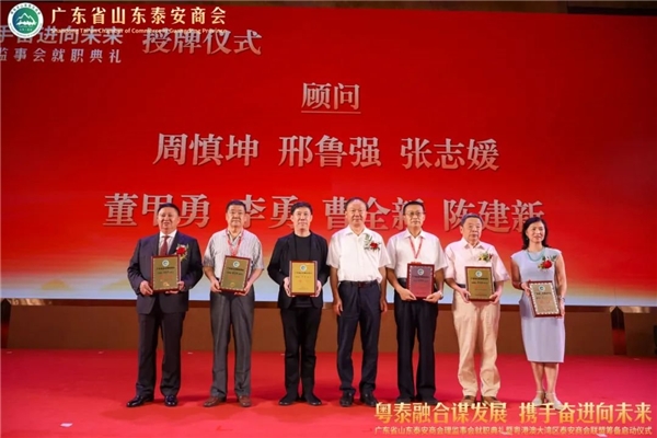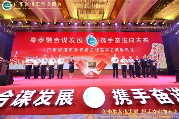 泰安市委常委、统战部部长成丽,泰安市工业推进委副主任、党委书 记、泰安市一级巡视员宋洪银,泰安市人民政 府副市 长、市工商联主席冯能斌,泰安市委统战部分管日常工作的副部长侯红岩,泰安市人民政 府副秘书长侯召席,泰安市委统战部副部长、市工商联党组书 记李培国,全国工商联常委、中国品牌建设促进会副理事长、广东省工商联副主席、山东省鲁商联盟会会长、广东省山东商会江南,山东省人民政 府驻广州办事处副主任刘风俊,广东省社会组织管理局科长宁彬,广东省山东泰安商会会长秦亮,广东省山东泰安商会监事长李建国,广东省山东商会秘书长周慎坤,共同为广东省山东泰安商会进行揭牌。