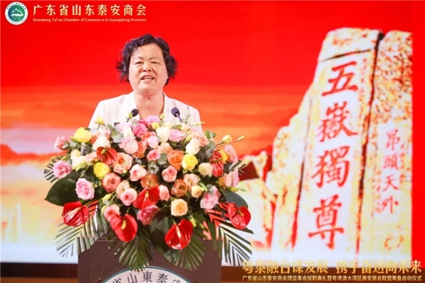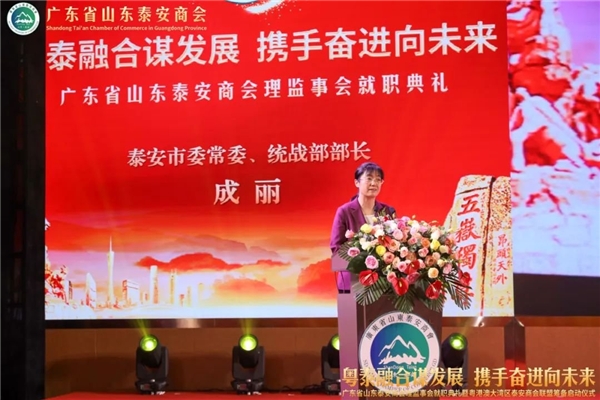 泰安市委常委、统战部成丽部长讲话。她指出,广东省山东泰安商会和粤港澳大湾区泰安商会联盟筹委会的成立,是广东、泰安两地商会发展的大事、喜事,架起了粤港澳地区与泰安联络沟通、合作交流的新桥梁。希望广东省山东泰安商会全面加强自身建设,充分履行职责,积极发挥作用,多做联络联谊、牵线搭桥、助推发展的工作,不断提高商会的组织向心力、成员凝聚力和社会贡献力。希望粤港澳大湾区泰安商会联盟筹委会加快推进联盟组建进程,充分联络吸纳粤港澳大湾区优秀企业家加入组织,通过产业协同、资源互通、交流合作等方式,聚合资源优势,放大集群效应,打造国内一流的商会联盟平台,为粤港澳地区和泰安改革发展增添新的动力。