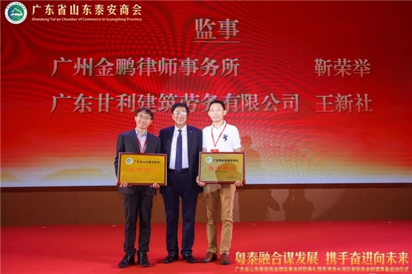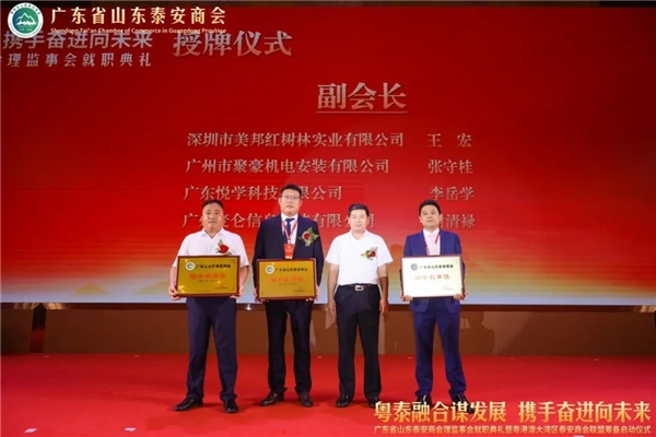 广东省山东泰安商会李乐合、孙虎常务副会长为广东省山东泰安商会理事颁发牌匾