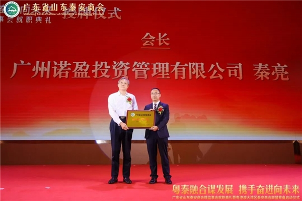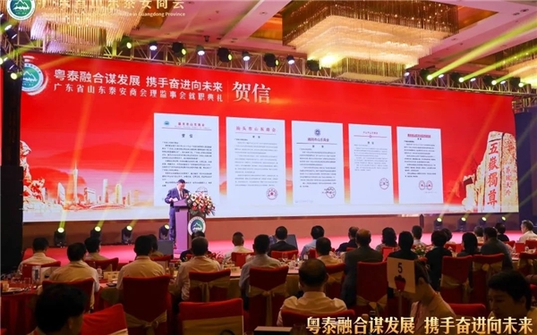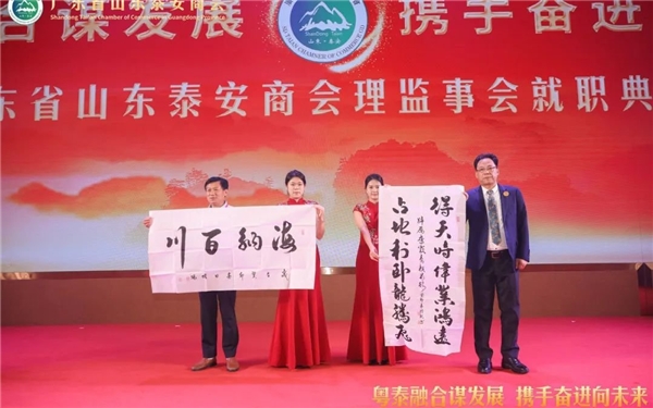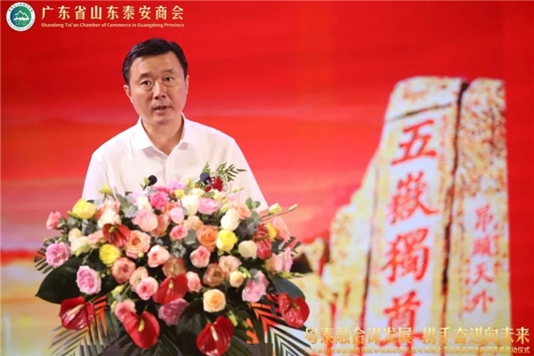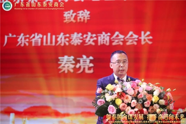秦亮会长表示,我们全体会员将发扬新时代“泰山石敢当的精神”、“泰山挑山工精神”,敢于担当、勇于负责、埋头苦干、永不懈怠,为实现今天典礼的主题:“粤泰融合谋发展, 携手奋进向未来”而努力奋斗。首长、领 导各位嘉宾,我们一定能行稳致远,进而有为,不辜负广东和泰安两地领 导及所有关心支持泰安商会发展的亲朋好友的期望,为两个家乡高质量发展,贡献我们的力量,体现新时代泰商的社会担当。