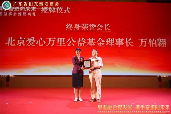 泰安市委常委、统战部部长成丽为万伯翱终身荣誉会长颁发牌匾(由中国国际友好联络会原会长助理、常务理事曹全新代领)
