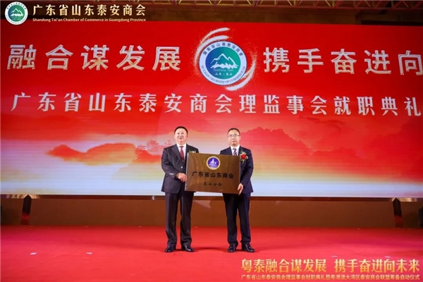 泰安市副市 长、工商联主 席冯能斌(右)为广东省山东泰安商会颁发“泰安市双招双引工作站”,广东省山东泰安商会会长秦亮(左)上台接牌