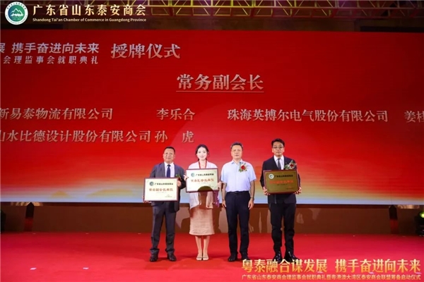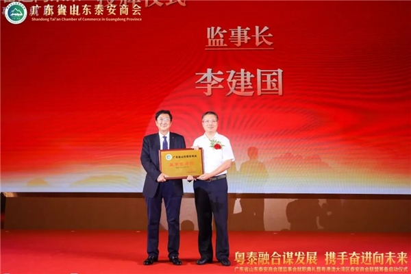 中共泰安市委统战部、泰安市工商联授予李建国同志为粤港澳大湾区泰安商会联盟筹委会主任,泰安市副市长、工商联主席冯能斌为李建国主任颁发牌匾;同时授予广东省山东泰安商会为“泰安市双招双引工作站”,广东省山东泰安商会会长秦亮上台接牌。