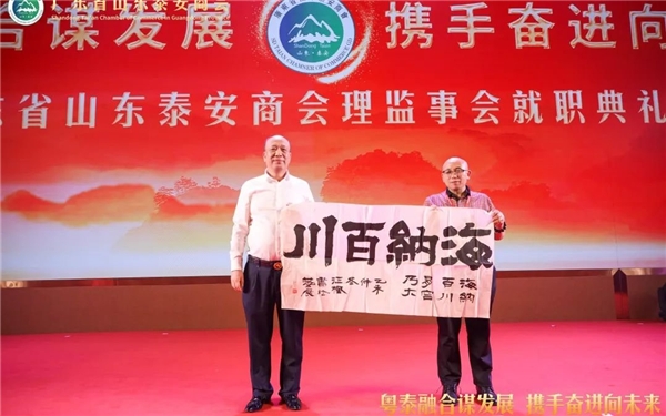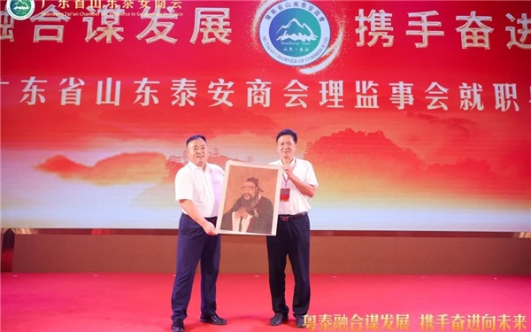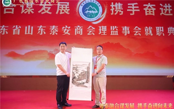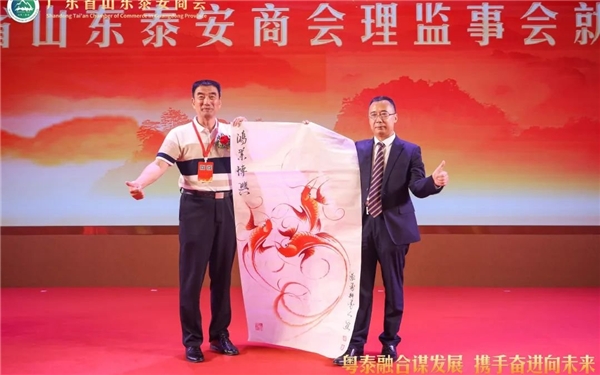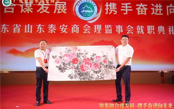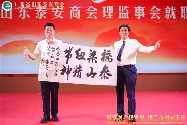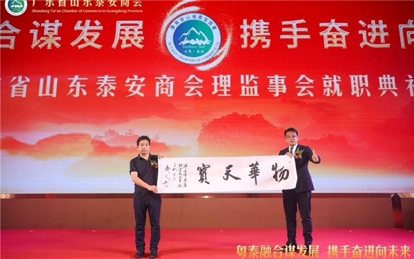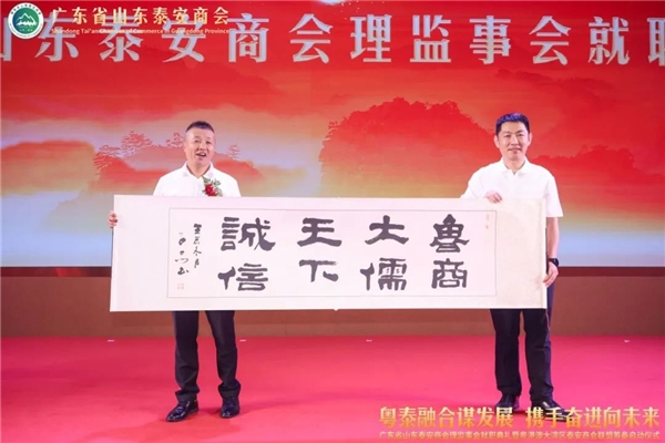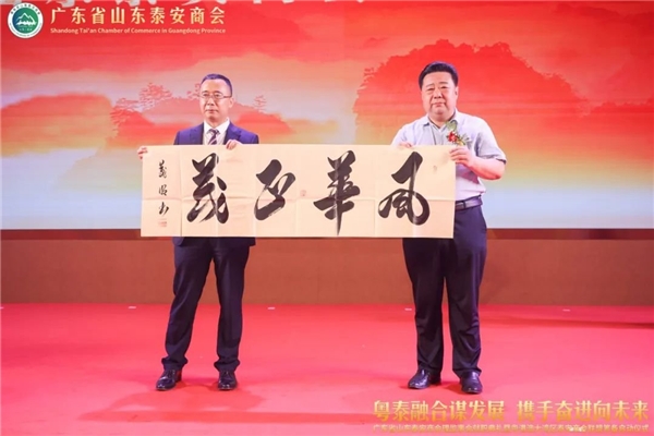 泰安市政协常委、市总商会副会长、泰山商会执行会长、全国泰安商会联盟秘书长徐涛(左)向广东省山东泰安商会赠送墨宝