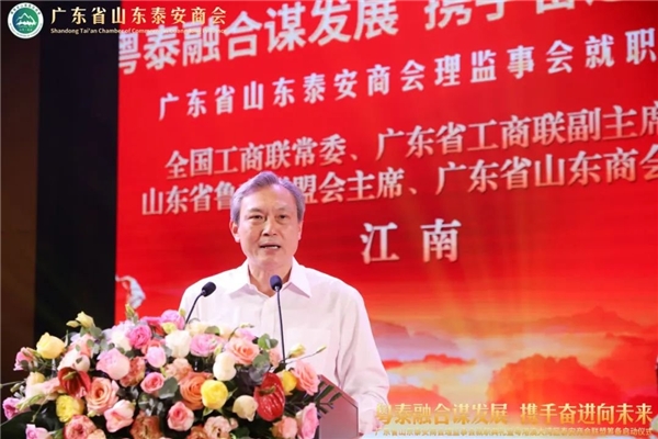 全国工商联常委、广东省工商联副主 席、山东省鲁商联盟会主 席、广东省山东商会会长江南讲话。他说,在这火热的夏季,今天大家相聚在美丽的羊城广州,参加广东省山东泰安商会理监事就职典礼和粤港澳大湾区泰安商会联盟筹备启动仪式,这是具有历史纪念意义的好事、喜事。