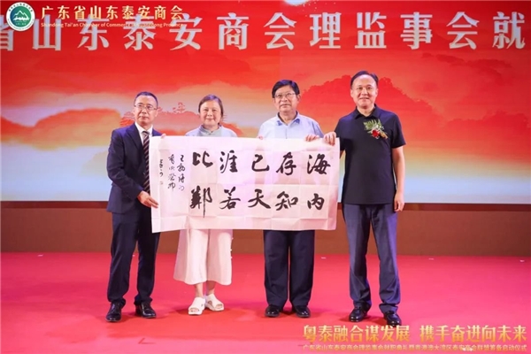 原山东省政 府驻上海办事处主任、原山东省政协常委、港澳台侨和外事委员会副主任、山东省委党校外聘李斌教授向广东省山东泰安商会赠送墨宝