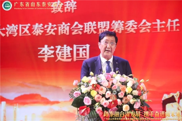 粤港澳大湾区泰安商会联盟筹委会李建国主任致辞。他说,承蒙泰安市委、市政 府和市统战部、工商联的信任和重托,任命我为联盟筹委会主任,深感责任重大。李主任指出,今年4月份,成丽部长带队到粤港澳深入开展“泰山关爱行动”,努力推动联谊总会工作创新发展。在深圳、珠海期间,成丽出席深圳市山东泰安商会成立大会和珠海泰安商会座谈会,对两地商会建设发展提出希望和要求,为组建粤港澳大湾区泰安商会联盟奠定了坚实基础。粤港澳大湾区是国家级的重大战略部署,是国家建设世 界级城市群和参与全球竞争的重要空间载体。身处湾区的我们泰商,更有理由在一起凝聚共识,希望大家能抓住机遇、团结一心,共同促进粤港澳大湾区和泰安的经济发展和社会进步。作为粤港澳大湾区泰安商会联盟筹委会主任,我将带领着大湾区的泰安商会不遗余力,加强粤港澳大湾区泰安商会之间的联系与合作,为会员企业提供更广阔的发展平台和更多的资源支持;继续引领在粤泰商,不忘泰商的灿烂文化,不愧泰商的使命担当,密切配合泰安市委市政 府、市统战部、市工商联等相关部门的工作,发挥连接泰安与粤港澳大湾区的桥梁纽带作用,以更高的服务水平、更广的合作视野,不断推动泰安与粤港澳大湾区产业链、供应链、创新链、人才链的对接,积极宣传和推介泰安,邀请当地企业家到泰安投资兴业,体验泰山文化,推动大湾区和泰安的经济发展腾飞!