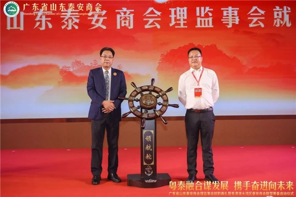 深圳市山东泰安商会薛传江会长(左)向广东省山东泰安商会赠送领航舵纪念品