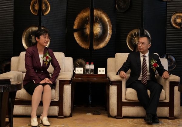 中共泰安市委常委、统战部部长成丽(左),广东省山东泰安商会会长秦亮(右)
