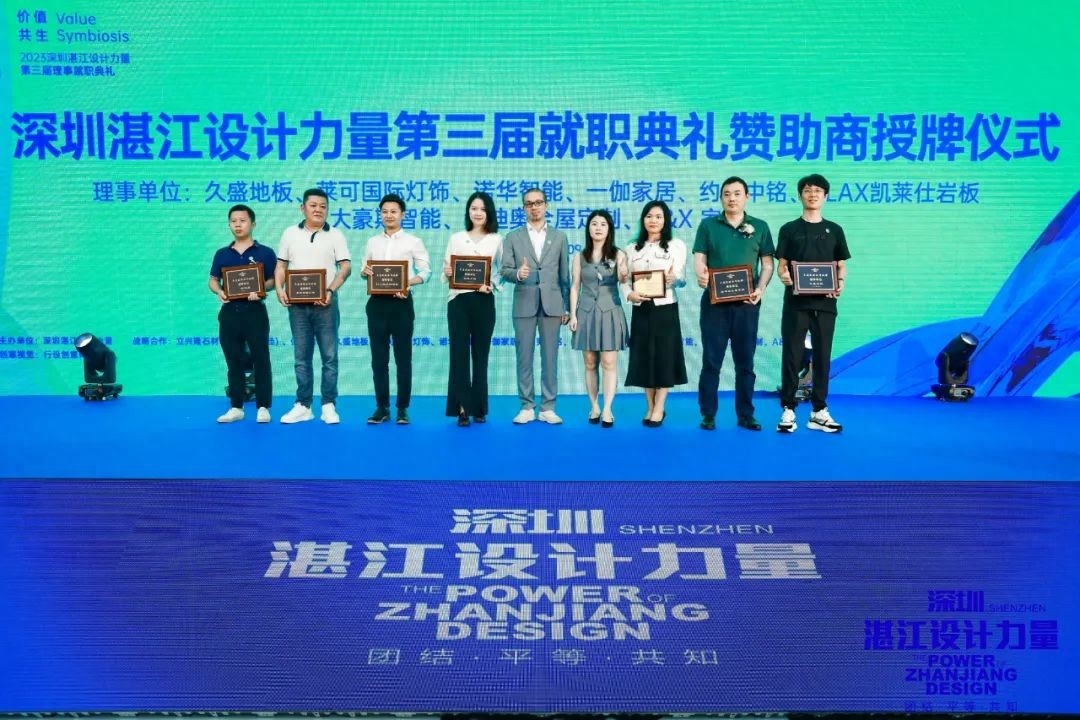深圳湛江设计力量秘书长叶小花和监事长黄龙立为理事单位授牌,久盛地板、莱可国际灯饰、诺华智能、一伽家居、约克中铭、KLAX 凯莱仕岩板、大豪斯智能、法迪奥全屋定制和A&X 家具授牌