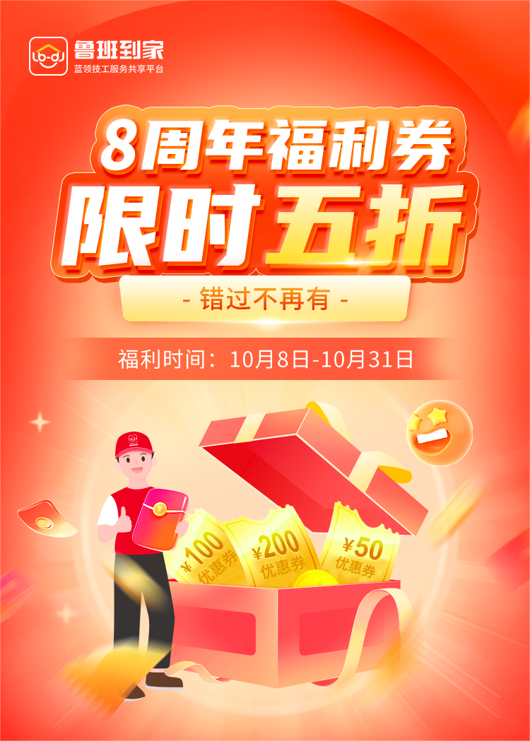 鲁班到家推出8周年补贴活动于10月8日一直持续到10月31日。在活动时间内,鲁班到家狂撒2亿庆生福利壕补广大用户,全场充值返点优惠福利送不停,为家具、卫浴、灯具、晾衣架、锁具、家电、窗帘等150万家居商家提供一站式专业的售后解决方案。