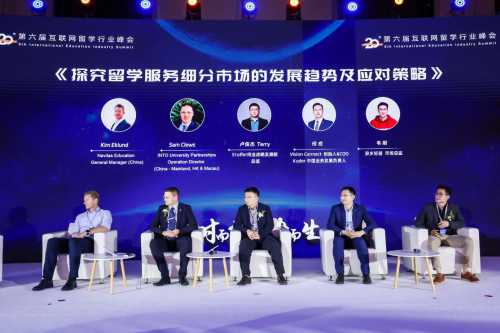 峰会最后一个环节,Navitas Education General Manager (China):Mr Kim Eklund、INTO University Partnerships Operation Director (China - Mainland, HK & Macau):Mr Sam Clews、51offer 同业战略发展部 总监 卢俊杰、Vision Connect 创始人&COO,Kuder 中国业务发展负责人 何戎、异乡好居市场总监 韦刚分享对留学服务细分市场的发展趋势及应对策略的看法和见解。