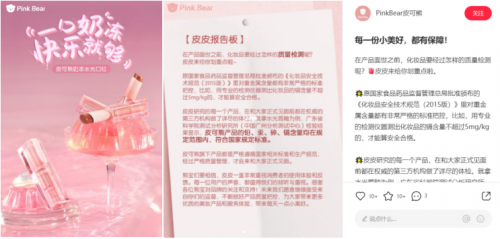 PinkBear皮可熊的每一个产品都会在少女们相遇之前做好严格“体检”,严格遵循国家相关标准和生产规范,对每一道生产环节都经过层层把控,成分含量均进行严格检测。根据品牌送测至广东省科学院测试分析研究所(中国广州分析测试中心)的检验结果显示,PinkBear皮可熊产品的铅、汞、种、镉含量均在规定范围内,符合国家规定标准。PinkBear皮可熊一直在产品研发方面不懈努力,希望能够为PinkBear皮可熊女孩儿们带来有心意、温暖、舒适的服务体验,根据少女们对彩妆产品的需求进行不断地迭代与优化,以严格的品质管理守护每一个女孩儿的可爱少女心。