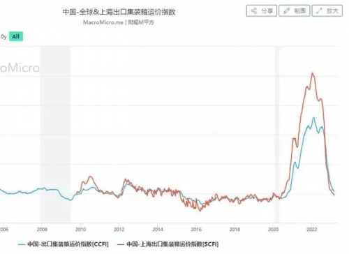 港口堆积成山,主要是因为在疫情初期人力、运输、集装箱等各方面资源紧缺,价格暴涨就导致供应大量增加,集装箱生产超平时的三倍,所以产能过剩、运价暴涨等的情况出现也在意料之内。从中国-全球&上海出口集装箱运价指数表内就可以看到,自2022年开始,集装箱的运价就在垂直下降。