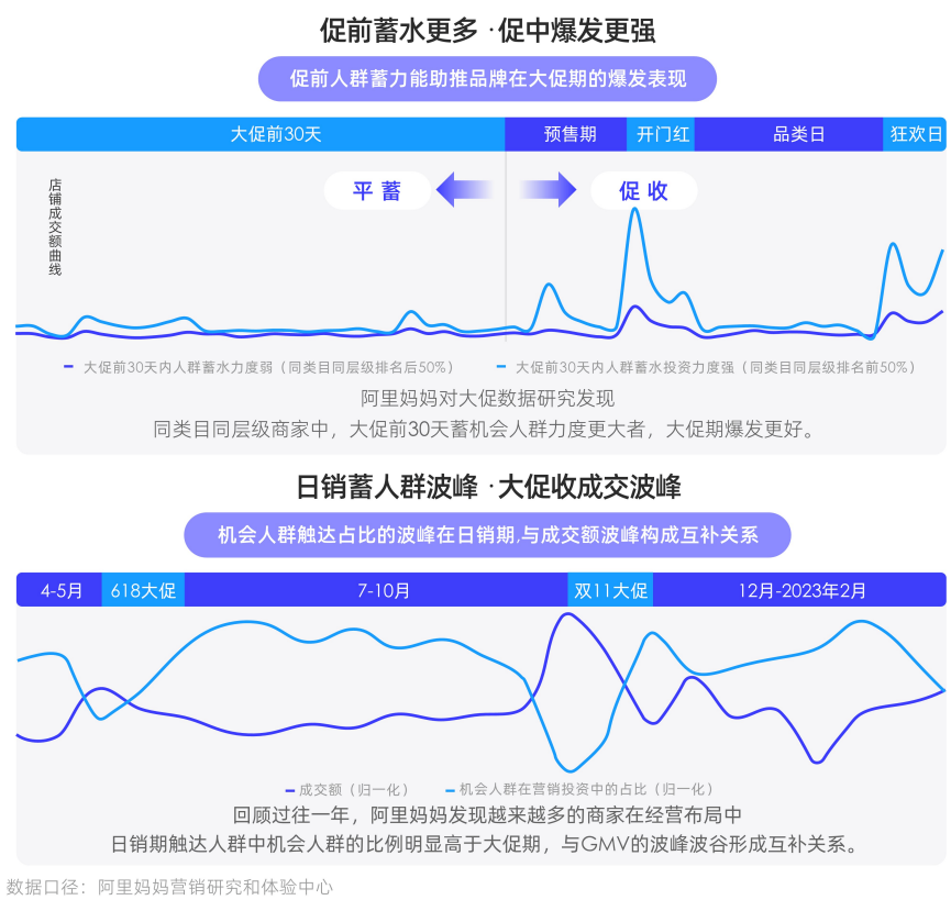 回归过往一年,阿里妈妈发现越来越多的商家在经营布局中日销期触达人群机会人群的比例明显高于大促期,与GMV的波峰波谷形成互补。尤其是在大促前30天蓄机会人群力度更大的商家,相比同类目同层级的商家在大促期爆发更好。