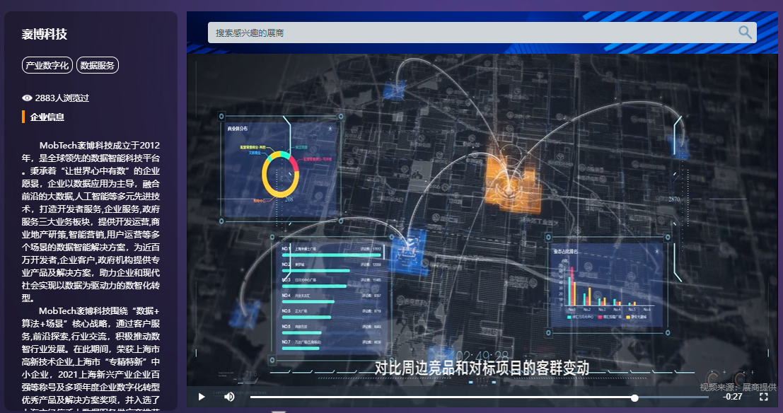 作为领 先的数据智能科技平台,MobTech自成立以来,坚持以数据应用为主导,融合前沿的大数据、人工智能等多元先进技术,积极探索创新技术与应用场景的深度融合,推进数字技术在快消、企业服务、商业地产、公共服务等领域的应用。