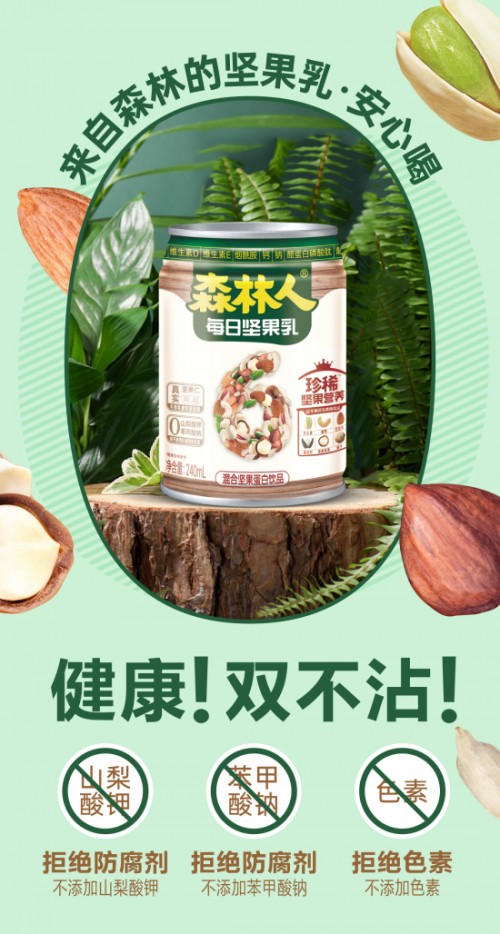 主打“珍稀坚果,珍稀营养”的森林人每日坚果乳,将这六种珍稀坚果的科学配比,让消费者在享受美味的同时,也能摄入丰富的营养。