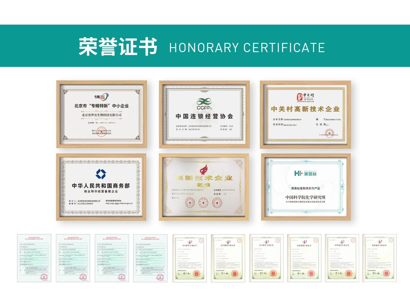 普世安中国致力于头发健康产业革新,是国家高新技术企业及“专精特新”中小企业,2021年“中国科学院化学研究所分子纳米结构与纳米技术重点实验室”提供技术支持,针对头发健康领域研发脱发、白发两大系列产品已拥有获证自主知识产权27项,其中发明专利1项、实用新型专利9项、外观专利2项及计算机软件著作权15项;此外,4项发明专利正在申请中。同时,多项黑奥秘防脱育发系列产品通过了国家食品药品监督管理局的特妆认证。