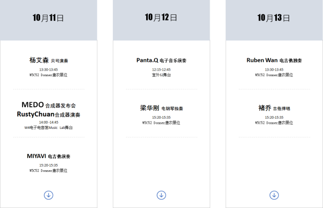 在展会首日,即10月11日星期三,与会者可以前往W4 电子电音馆的Music Lab舞台观看来自RustyChuan的合成器演奏;在Donner唐农主展位W5C52,日本吉他演奏家MIYAVI将使用唐农Donner Arena2000综合效果器展示其极具特色的slap风格吉他技法。来自中国台湾的知名贝司演奏家杨艾森也将会在展会首日于Donner 唐农展位进行贝司演奏和产品试用。