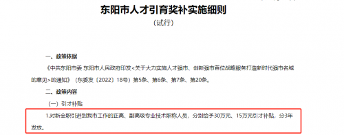现在的人才竞争压力越来越大,扶持的政策待遇也越来越优厚。以浙江省东阳市为例,人社局与财政局联合发布了一份文件,其中详细介绍了《东阳市人才引育奖补实施细则》。