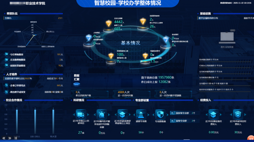 数据是教育数字化的核心资产,而数据价值的实现,不仅在于 “数据互通”,更在于 “数据可用”。V11 版本依托 “业务+数据” 双中台的天然整合优势,彻底打破信息孤岛,实现了 “数据主动找人”的全新体验,颠覆了传统数据 “被动查询” 的模式。通过手机看板、大屏驾驶舱等载体,精准推送管理者关心的核心数据,让校领导、学工处长、辅导员、宿管员等不同角色均可实时获取专属信息;同时构建全生命周期数据治理与安全体系,符合上级部门的数据分类分级标准,保障数据安全合规。随着数据资产的积累,结合 AI 应用功能,数据将真正成为院校办学决策、业务改进的核心支撑。