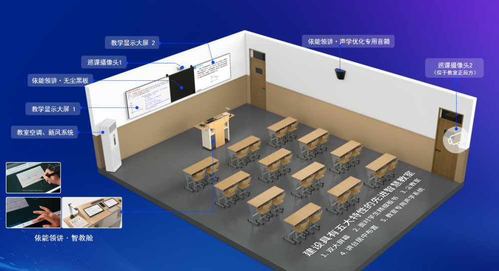 物理空间:以依能领讲?智教舱为核心的智慧教室,符合双大屏幕、面对学生精细板书、无尘黑板、讲台居中布置、教室专用声学系统五大特性,打造更友好的教学环境;