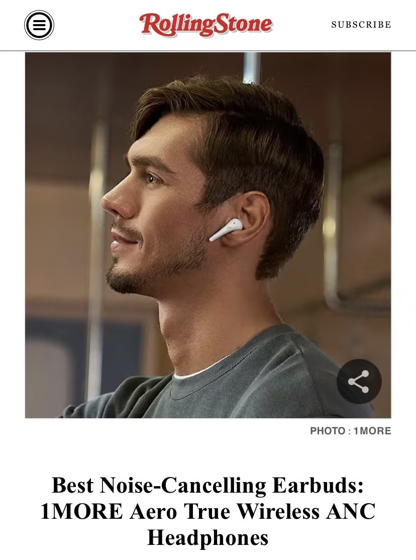 《RollingStone》(滚石)是美国的权 威音乐杂志,创办于1967年,是目前西洋乐坛影响力最 大的文化刊物之一,该杂志不定期发表的各项排名资讯,备受业界关注和重视。在过去一年里,《RollingStone》的产品编辑团队测试了数百种蓝牙耳机、头戴式耳机、扬声器和音响系统,综合性价比和实际使用效果,发布了《2023年滚石音频奖》,12款深受发烧友追捧的蓝牙耳机上榜,1MORE Aero荣获最 佳降噪耳机。