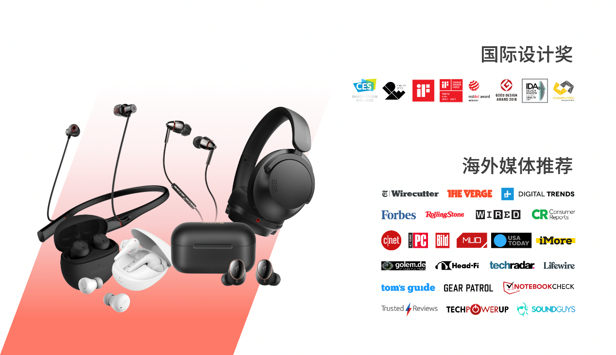 1MORE万魔耳机专注专业声学与智能软硬件的研发,自2013年品牌成立以来,累积的授权专利达330件,斩获国际四大权威设计奖共 40 项(包括德国 iF 设计奖、德国红点设计奖、美国 IDEA 设计奖、日本G-Mark优良设计奖),连续 4 年 12 款产品获得美国 CES 创新设计奖,多款产品获得 EHA(欧洲硬件协会)“年度最 佳耳机奖”,美国知名权威媒体《消费者报告》亦将其 2 款产品列为全球耳机类 186 个名牌竞品中的第 一名、第二名向消费者重点推荐。众多来自行业机构、权 威杂志、评测网站和消费者的认可,既是对万魔耳机过往的肯定,也是万魔耳机不断科技创新的动力。