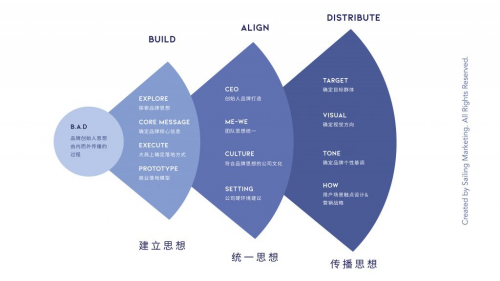 先说结论,品牌打造和落地的核心理念是:一、BUILD建立思想(品牌战略);二、ALIGN统一思想(内部文化);三、DISTRIBUTE传播思想(营销战略)。