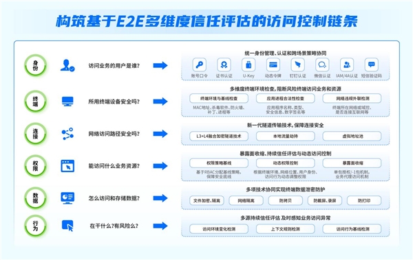 而零信任聚焦业务安全接入,从身份、终端、连接、权限、数据和行为等不同维度,帮助用户安全访问业务,构筑了基于端到端多维度信任评估的访问控制链条。