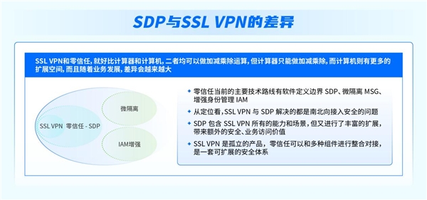 举个例子来说,SSL VPN 和零信任,好比是计算器和计算机,二者都做数据运算,但计算器只能做加减乘除,而计算机有着更多的扩展空间,不论是能力扩展,还是场景扩展,都会存在差异,且随着后续的发展,差异也会越来越大。