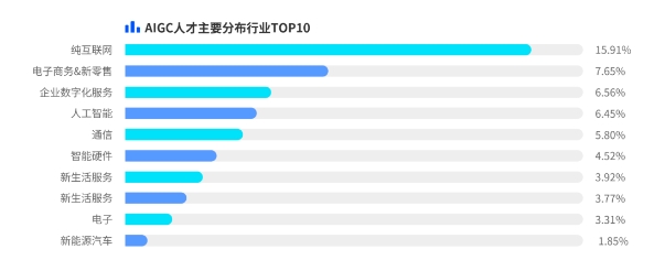 目前人工智能行业的AIGC⼈才保有量仅为6.45%,整体AIGC领域急需复合型⼈才,除专业要求外,NLP算法、深度学习、C++等词⾼频出现,算法和编程功底是就职的硬性要求。AIGC领域⼈才分布于多个新经济行业,其中纯互联网行业AIGC人才储备量多。