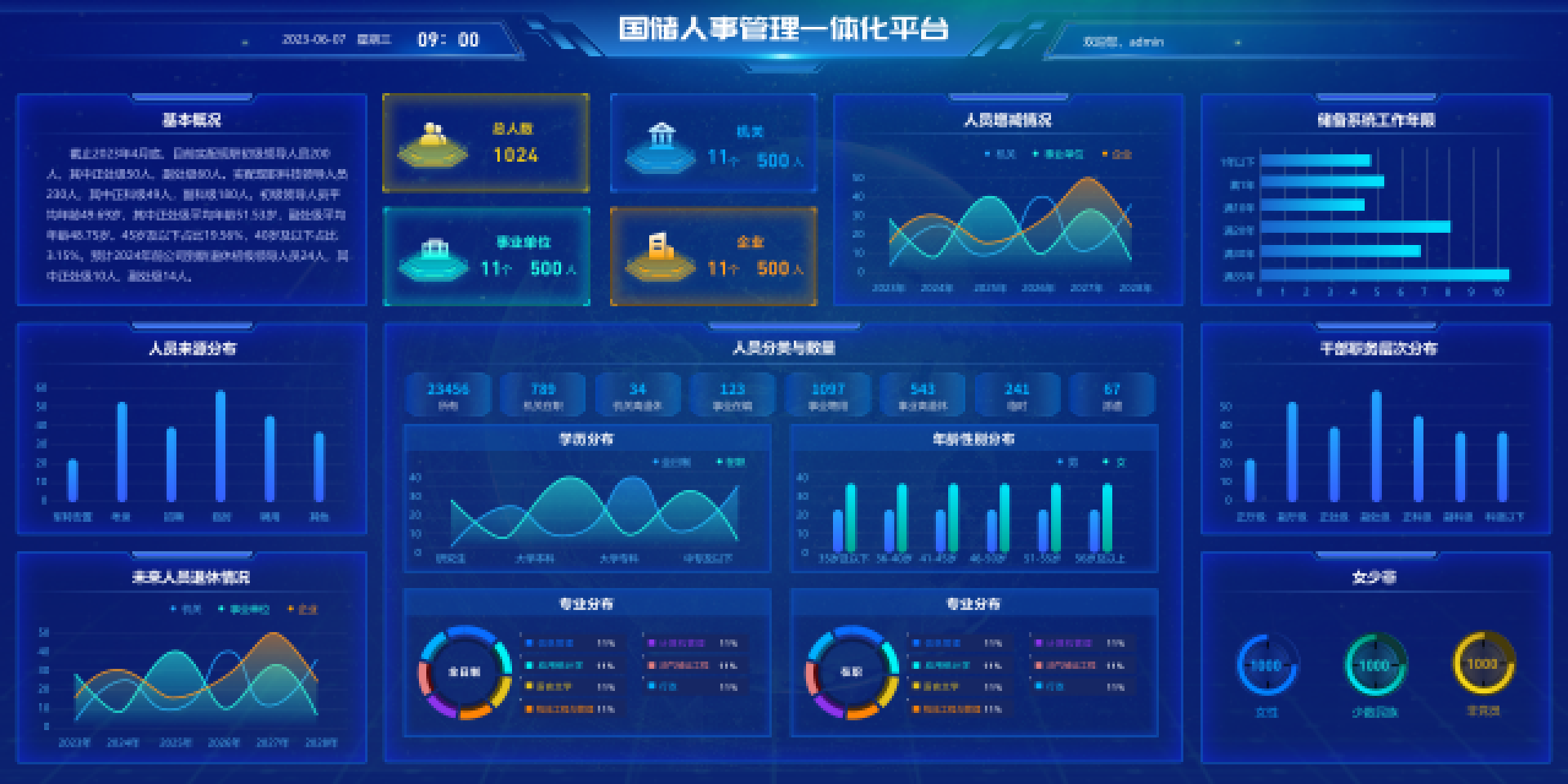 整合所辖机关、事业单位、企业多类型多层级干部人员信息,建立人力资源数据治理标准。此平台建设包括了79个信息集,1660个信息字段,形成了完整的人力资源信息源,涵盖人员入职管理、离职管理、人事异动等全周期管理。同时,通过对人员数万条大数据的分析,从用工形式、员工类别、职务变动、人员薪酬、离退休等维度,从而准确掌握人员动态信息,完善人事运行监管机制。