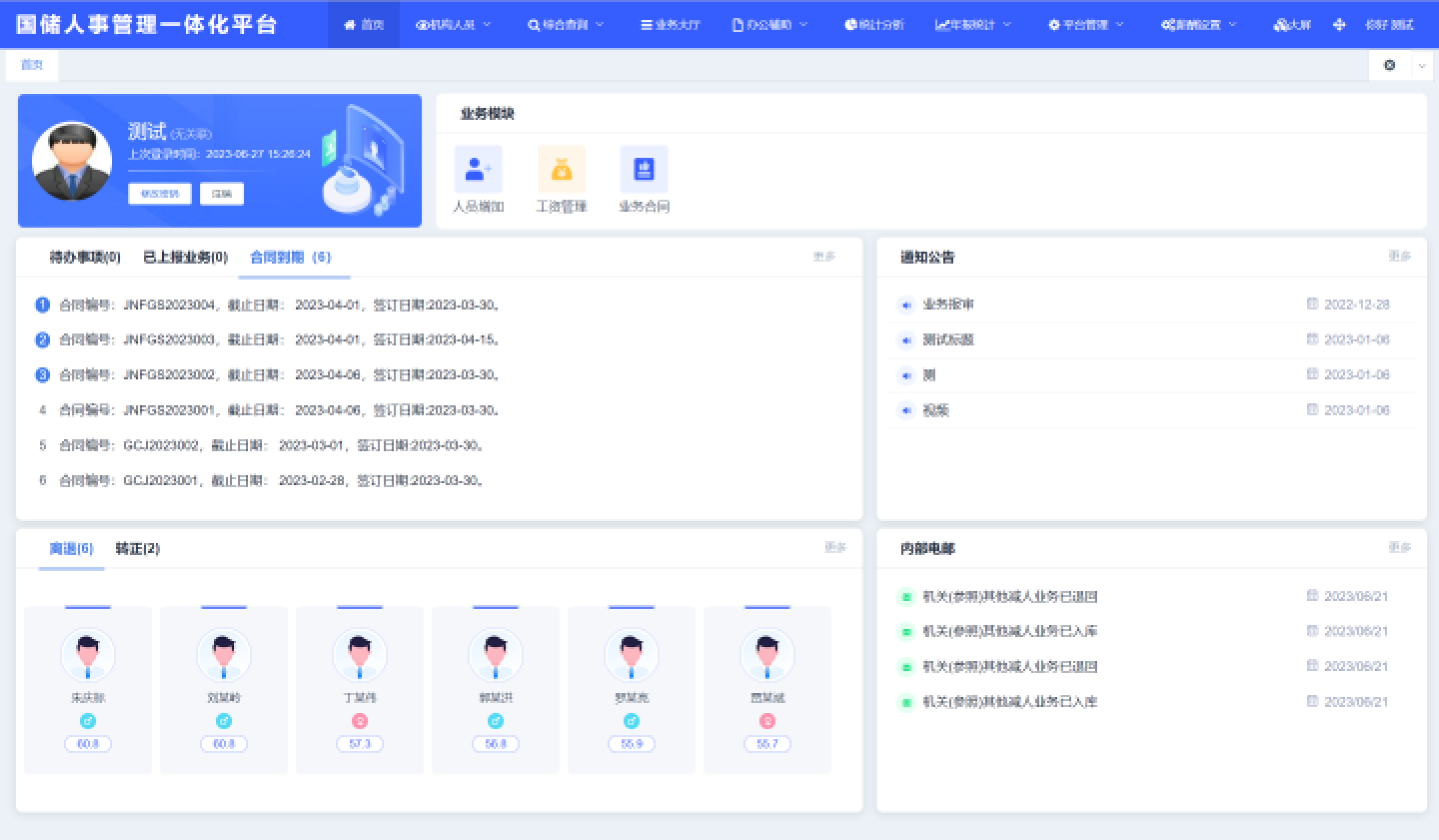 梳理组织、人事、业务管理需求,设计统一的“进、管、出”业务流程规范,构建完整的业务流程体系,实现业务的标准化,打造业务“事项闭环”,提高各业务之间的应用集成、数据集成、互联互通能力,提升业务办理效率。同时保持异动数据的及时和准确性,实现人事数据的“动态更新”。系统中设置员工入职、工资管理、合同管理等多项业务流程,同时设置预警提醒功能,通过数据监测触发预警,使业务被动处理变为主动处理。