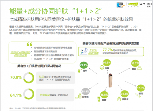 那么面对越来越个性化的护肤需求,如何为消费者提供精准科学的护肤解决方案?作为国内首创“仪器+面膜”护肤方式的品牌AMIRO觅光,在报告中为消费者揭开光电技术+功效成分,达到“1+1>2”效果背后的内在逻辑。