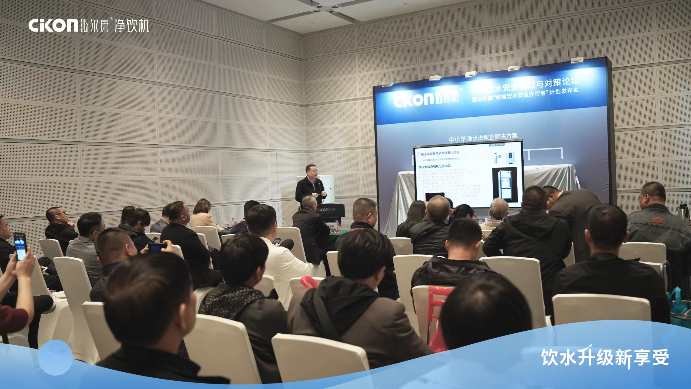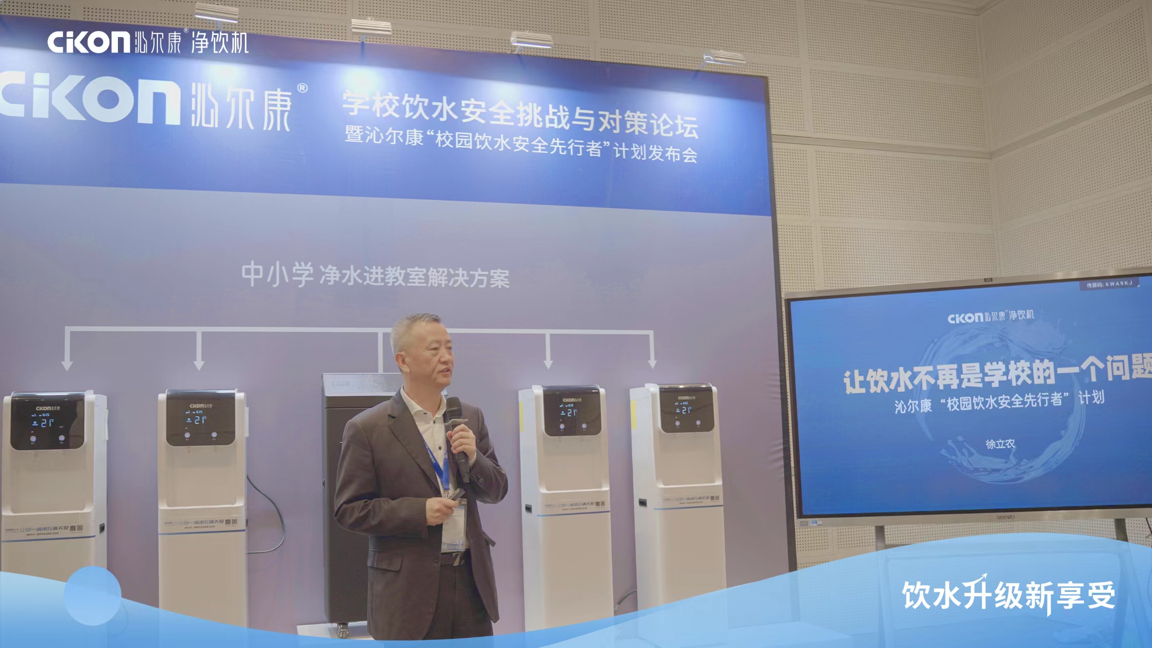 沁尔康董事长徐立农发布了“校园饮水安全先行者计划”,分享全管路消毒发明专利技术和装机落地实践案例。他指出,校园饮水的关键是“安全”,而沁尔康理解的“安全”包含水质、水温、设备三方面的内容。沁尔康最新推出的基于教室专用温开水管线机的净水进教室方案,用全管路自动消毒技术,确保出水细菌不超标;用热交换技术,让温开水装进教室,避免学生烫伤;用低压工作、安装专用挂件,防爆、防倾覆,从而解决了校园饮水中以上三方面的安全问题。同时,由于进教室的是管线机,制水主机安装在设备间,避免了制水时在教室发出噪音干扰教学。与管道直饮水相比,该方案施工简单、维护方便,与楼层净饮水平台相比,该方案更方便学生饮水,能提供更好的体验。