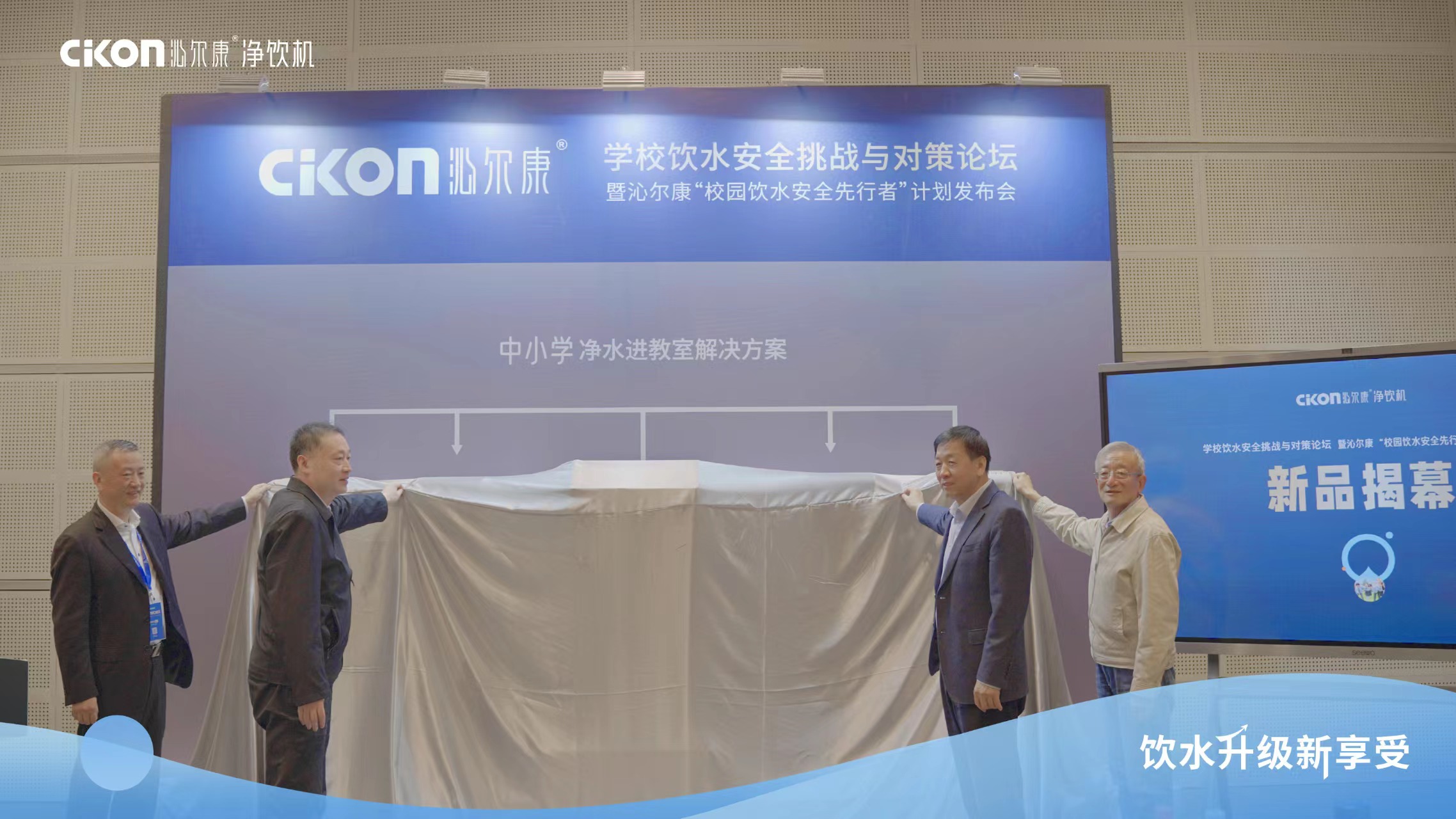 随后,李有增会长、辛珉副处长、鄂学礼教授与江苏沁尔康环境电器有限公司董事长徐立农共同为沁尔康“校园专用管线机进教室”产品解决方案揭幕。随着幕布落下,沁尔康教室专用温开水管线机+净化主机组合方案呈现在众人面前。简约大气的外形,强悍的实力,未来必将成为广大校园中新的风景线。