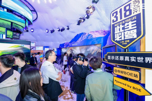 在工业复古与摩登时尚交汇融合的北京751火车头广场,京东方通过8K裸眼3D、MLED、超大尺寸透明OLED等顶尖显示技术在O_SPACE展馆内打造了一座虚实融合的沉浸式自然风光影像馆,馆内通过实景搭建与显示科技相融合,将“此生必驾”的国民公路G318的四季之美创意呈现,观众一进入展区就会被林芝的花开鸟鸣、羊湖的牧群山峦、珠峰的雪岭碧空与布达拉宫的雄伟壮阔所震撼。