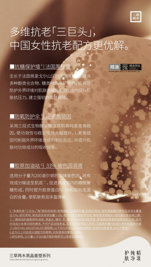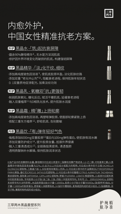 在对多维抗老成分深入研究的基础上,三草两木打造黑晶水、黑晶乳、黑晶霜、黑晶饮产品矩阵,搭建更适合中国人的全链路精准抗老方案。三草两木黑晶水含有90%的酵母精华,无水配方深度滋润肌底,修护、强韧肌肤双管齐下;三草两木黑晶精华添加了高纯度玻色因溶液,丰盈肌底、胶原、淡化干纹细纹,使肌肤保持年轻状态;三草两木黑晶乳削弱肌肤的氧化和糖化反应,为干瘪肌底注入胶原蛋白,延缓衰老进程;三草两木黑晶霜明晰轮廓线,精「雕」不跨脸,添加33%双峰玻色因,促进胶原蛋白生成、甄稀天然抗氧化剂99%高纯度麦角硫因、甄选法国“黑钻松露”以精纯能量造就肌肤非凡自愈力。