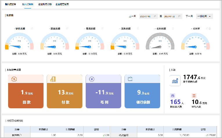 舰长控制台则是在销售、采购、库存、费用、毛利、人效等方面,展示企业经营成果,支持按照自定义时间检索和年度统计汇总,同时包含本月与上月同期经营情况对比,直观展现近期经营状况波动情况。