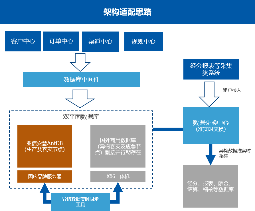 架构适配将应用系统和数据库之间、库和库之间多样化的交互方式收敛到统一的数据库中间件、数据库交换中心及实时同步工具三大组件,减少后续换库改造成本;