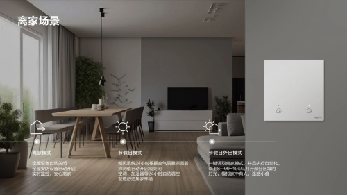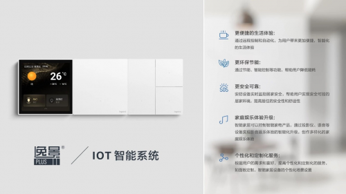 罗格朗拥有全套自有系统和完整解决方案,覆盖家庭对个性化、多元化、智能化场景的需求。逸景PLUS IOT实现灯光控制、温度/地暖/新风控制、窗帘控制、自定义场景联动、智能插座等多项功能,为用户带来舒适、安全的智能家居生活。
