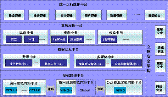 电子政务外网业务分为三类业务:专用业务、公用业务、互联网业务三类。专用业务是指如:金安工程、审计等政府部门的各纵向业务,是省政府直属各单位在省政务外网上利用MPLS VPN技术,连接本系统内部省、市、县(市、区)相关部门的纵向业务。公共业务:又可称之为横向业务,是指各单位实现信息共享与交换的业务,如:政务行政审批业务。互联网业务:对因特网公众提供服务,省政府直属各单位通过统一出口访问因特网,如:政府门户网站等。实际上电子政务外网的建设依据都是基于电子政务的业务分析所展开。